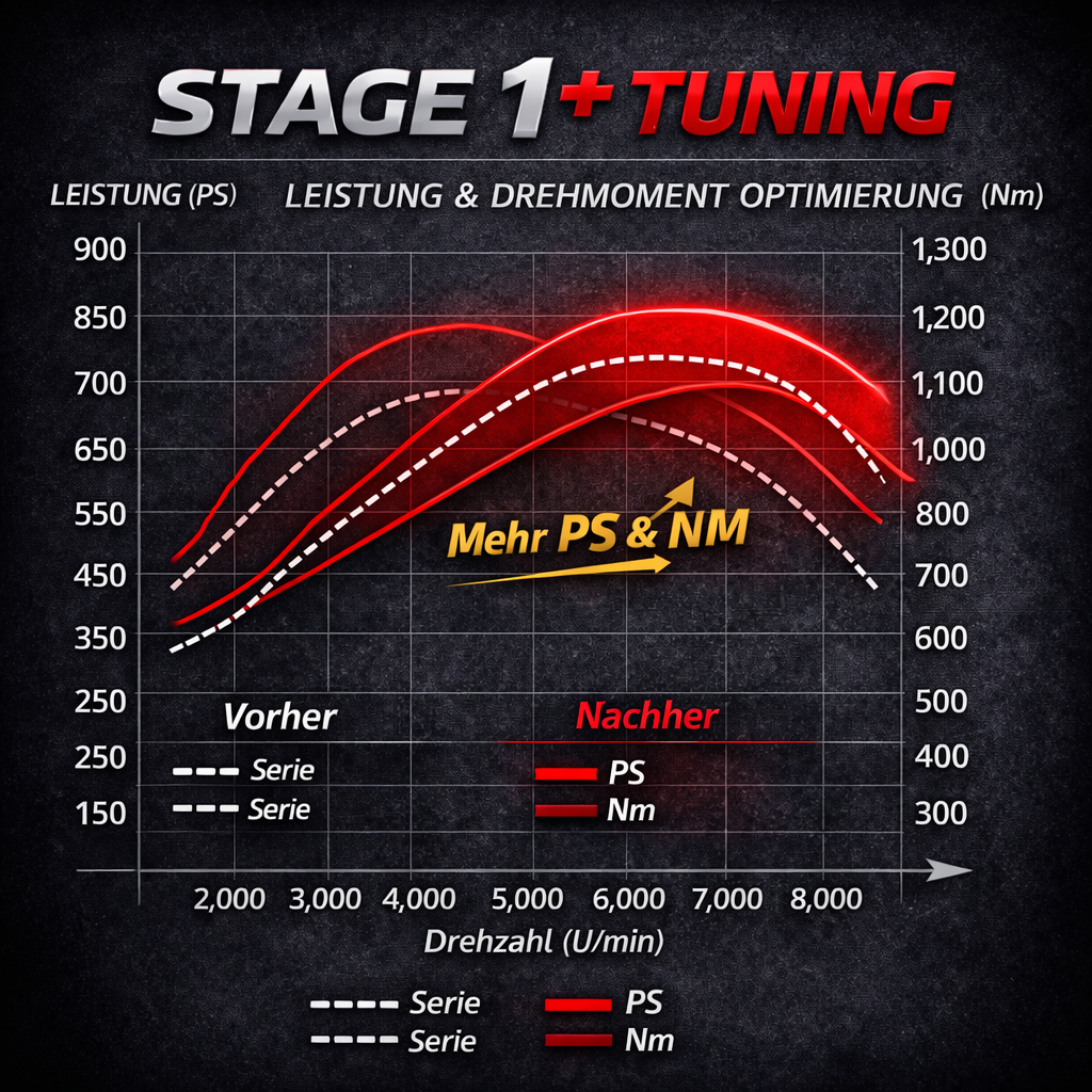 Neben der Motorsteuerung wird auch das Getriebe (TCU) angepasst, damit das erhöhte Drehmoment sauber und effizient übertragen wird. Das Resultat ist ein spürbar aggressiveres Fahrverhalten mit deutlich verbesserter Schaltperformance.